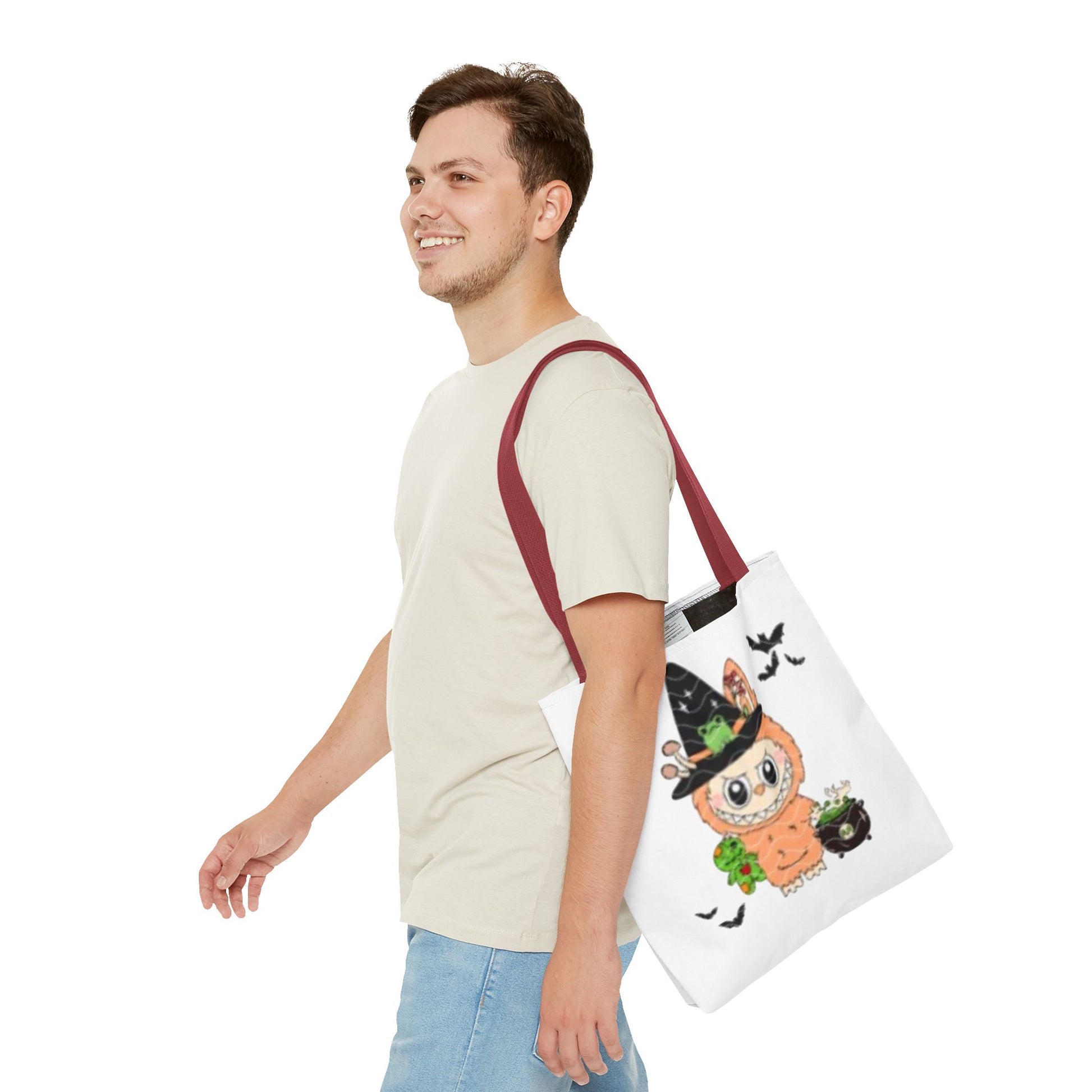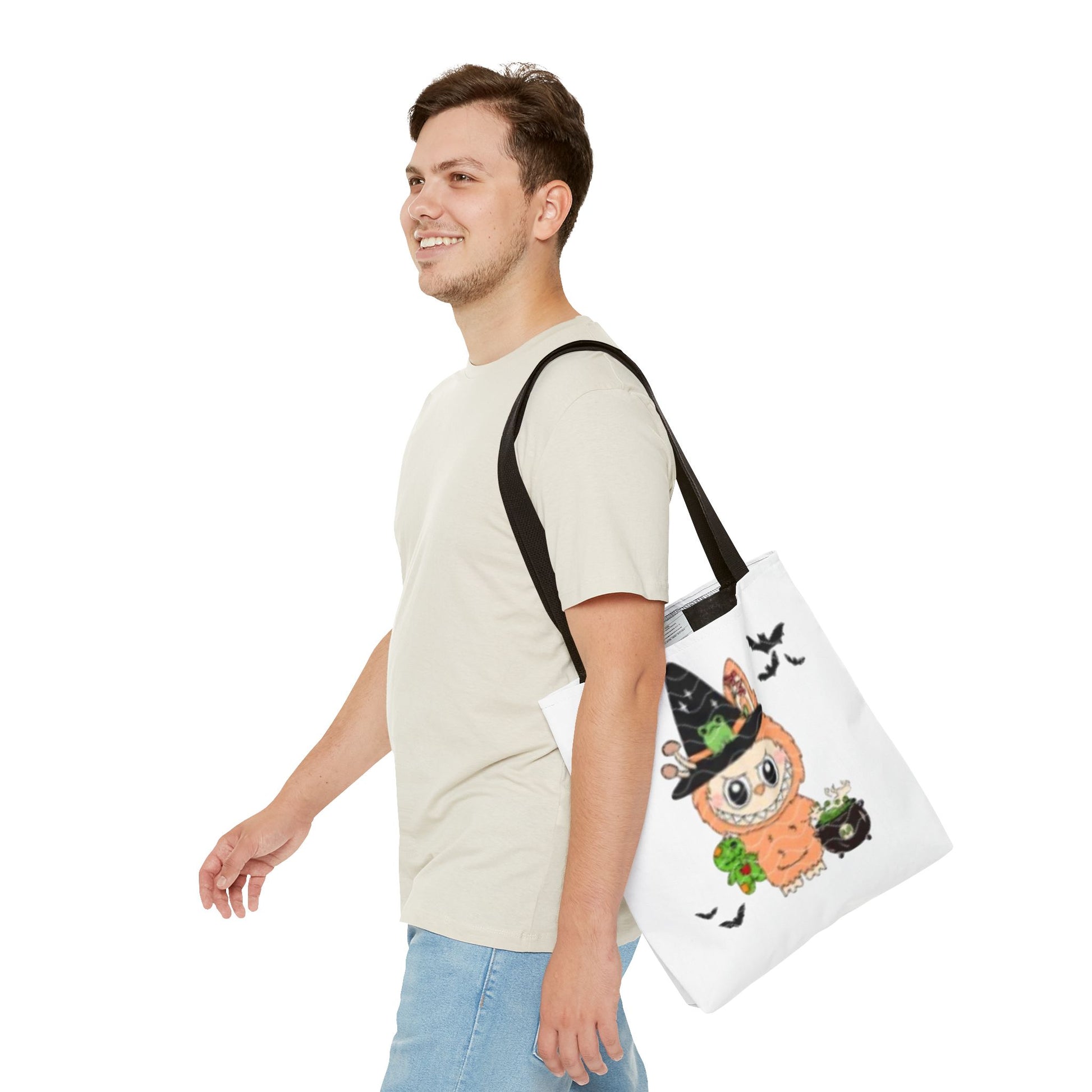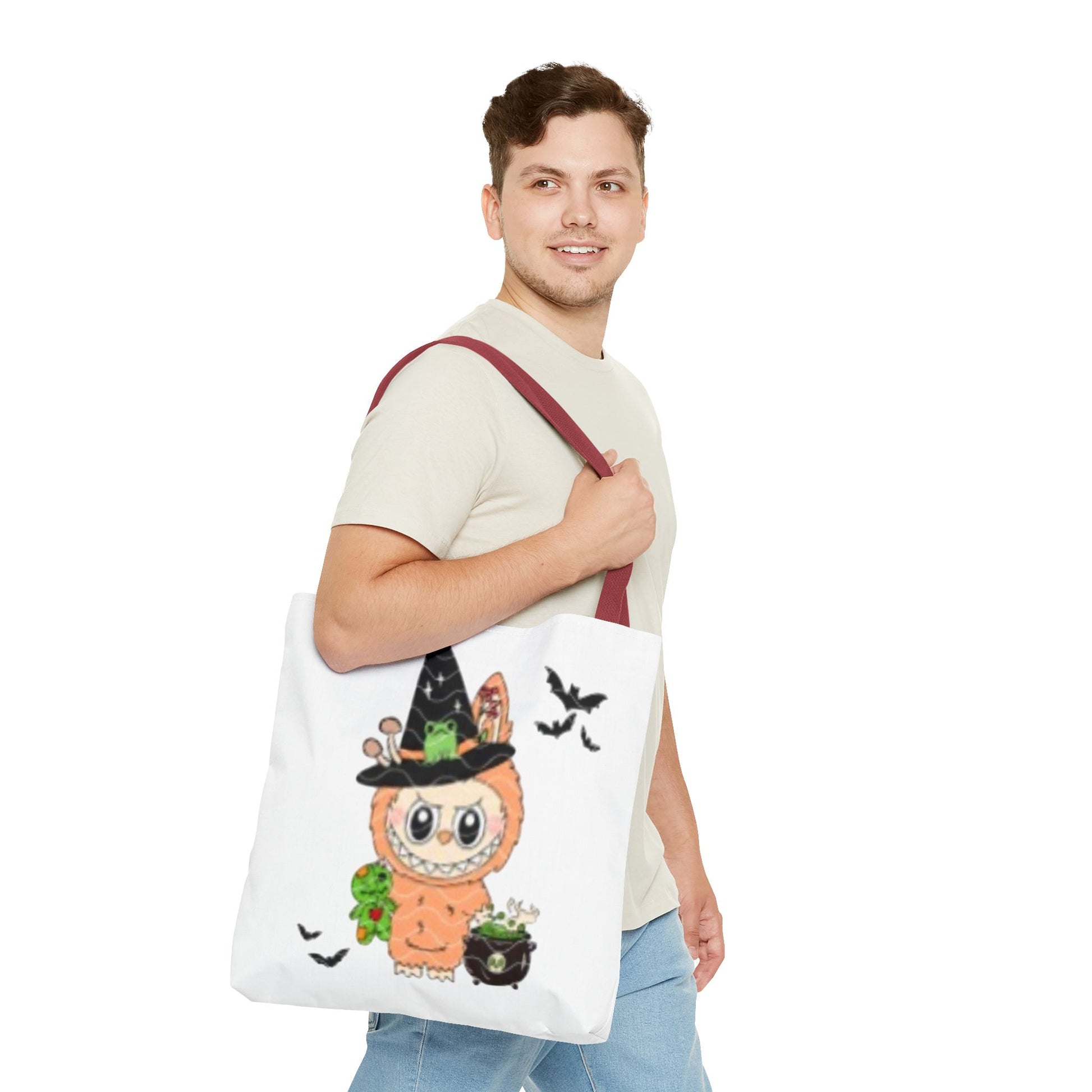 This Halloween trick or treat bag labubu is the perfect accessory for Halloween lovers of all ages. Made with durable 100% polyester, it features seamless thread color, reinforced stitching on handles, and boxed corners for added room. With 5 handle color options and 3 sizes available, this tote bag is versatile and ideal for carrying candy or other essentials during the spooky season.
